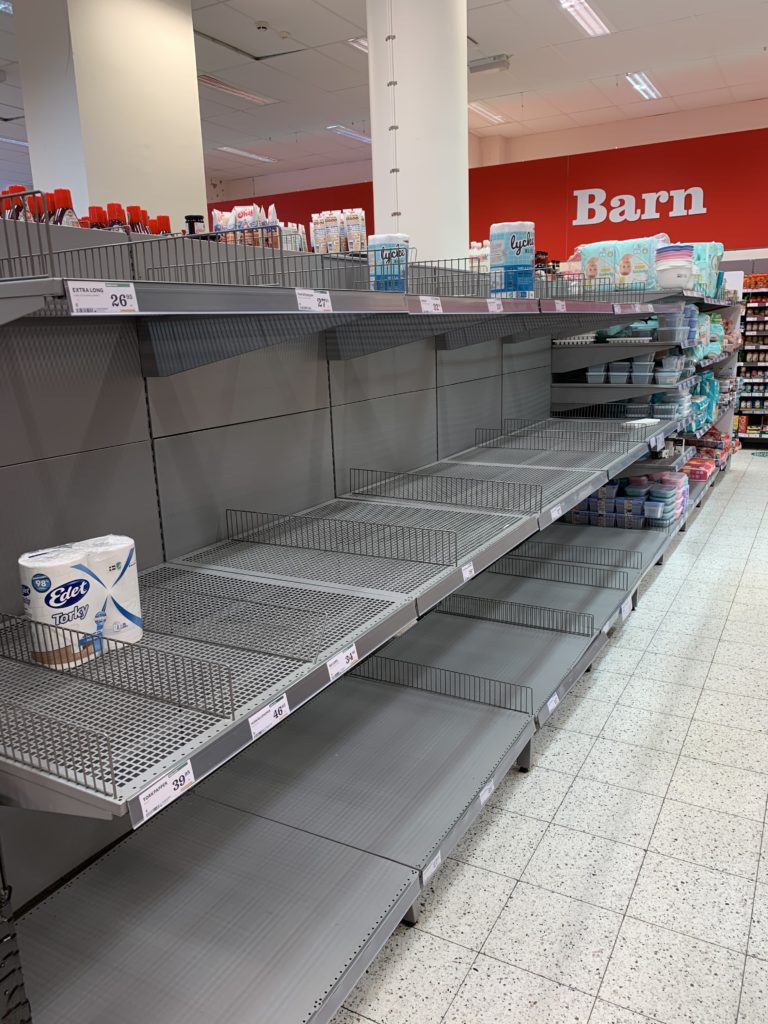 I also did some grocery shopping at a different store. I have been going to the Coop in Mårtenstorget but this time I tried the Hemköp (pronounced “hem-shurp”) on Södra Vägen. They both are smaller than a full-size American grocery store (a la Safeway, Cub, or Kroger), and more like the size of a Whole Foods or a Lunds, maybe a wee-bit smaller. Coop is more like a Whole Foods. A little higher-end and nicer interior. Hemköp is more like a Cub – a little more no-frills and industrial. Another difference is that the Coop has toilet paper, and Hemköp, well, here’s what that section looked like: