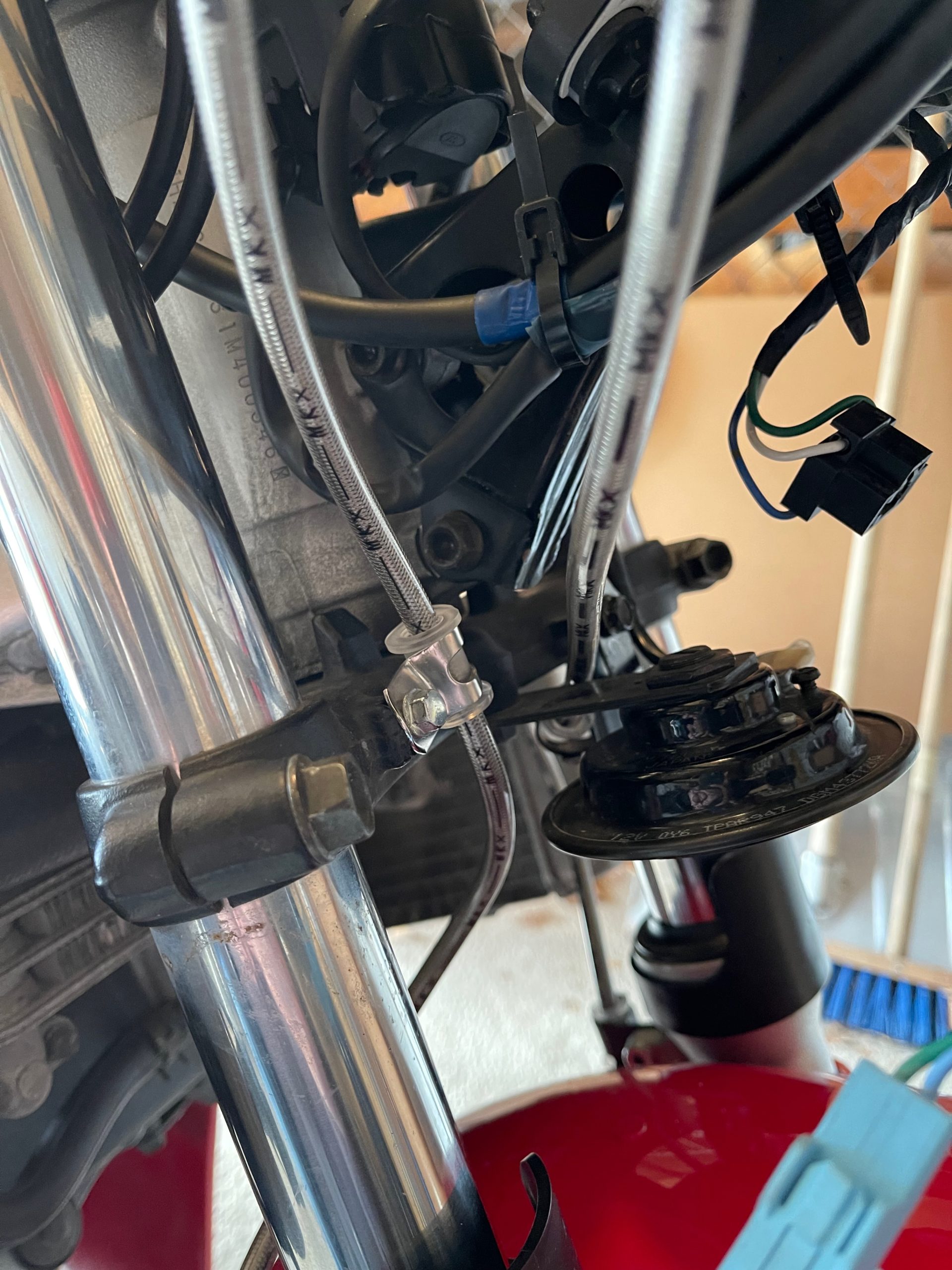 I also made sure that there was a generous bight in the sections that span over the fork travel zone. The stock lines had a 2-into-1 set up with a bolt-on hydraulic block at the junction. That meant that I needed to fabricobble a clip on the right side. When the new, properly threaded double banjo bolt arrives this coming week, the top will look something like this. Next week should be bleeding brakes, new windscreen, and maybe a ride?